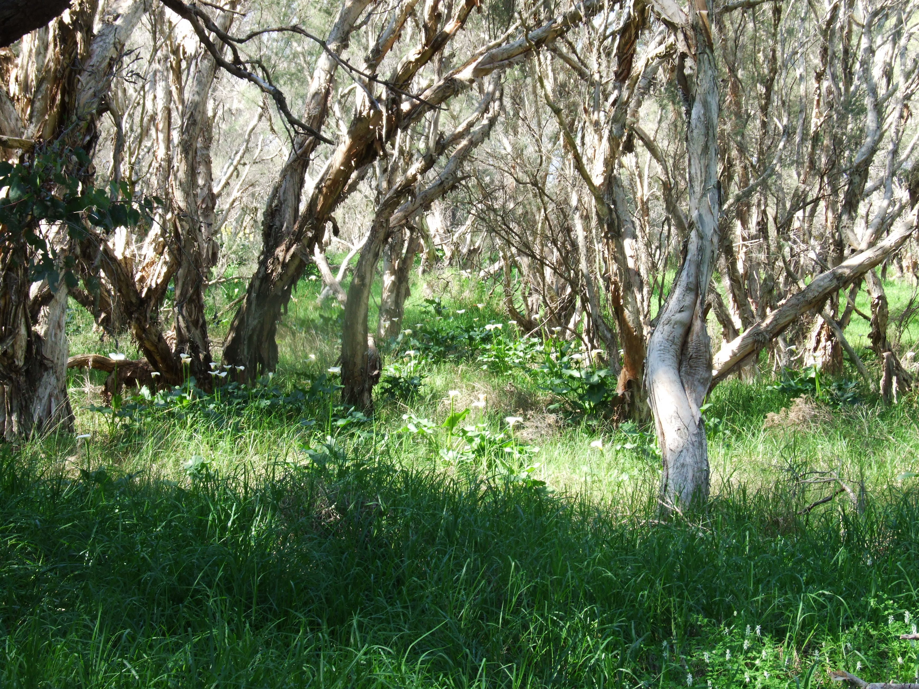 The Arum Lillies look pretty but they are a serious weed in south west Western Australia. Farming around Forrestdale Lake (about 25 km south of Perth) began in 1893, and in the 1920s sheep and cattle grazing took over from agriculture. During the 1940s the west side of the lake was heavily grazed by livestock, particularly during the dry summers when the lake’s fringing vegetation served as supplementary fodder. As a result, the land on the west side of the lake (pictured here) lacks native understorey plants and is infested with introduced plants such as these arum lillies.